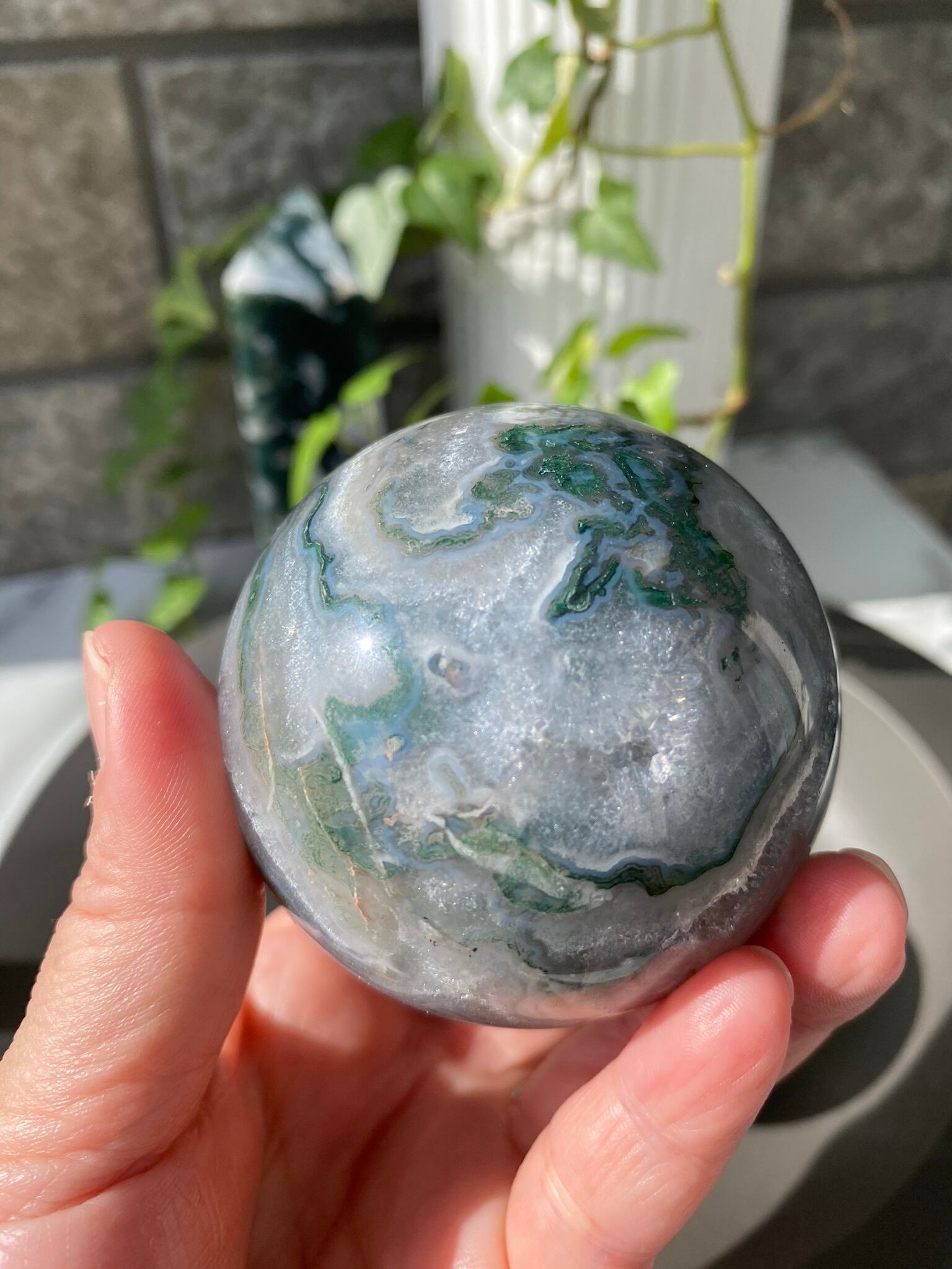 モスアゲートとブルーアゲートが混ざり合い、さらにクォーツの煌めきが加わり、とても素敵なスフィアが完成しています✨